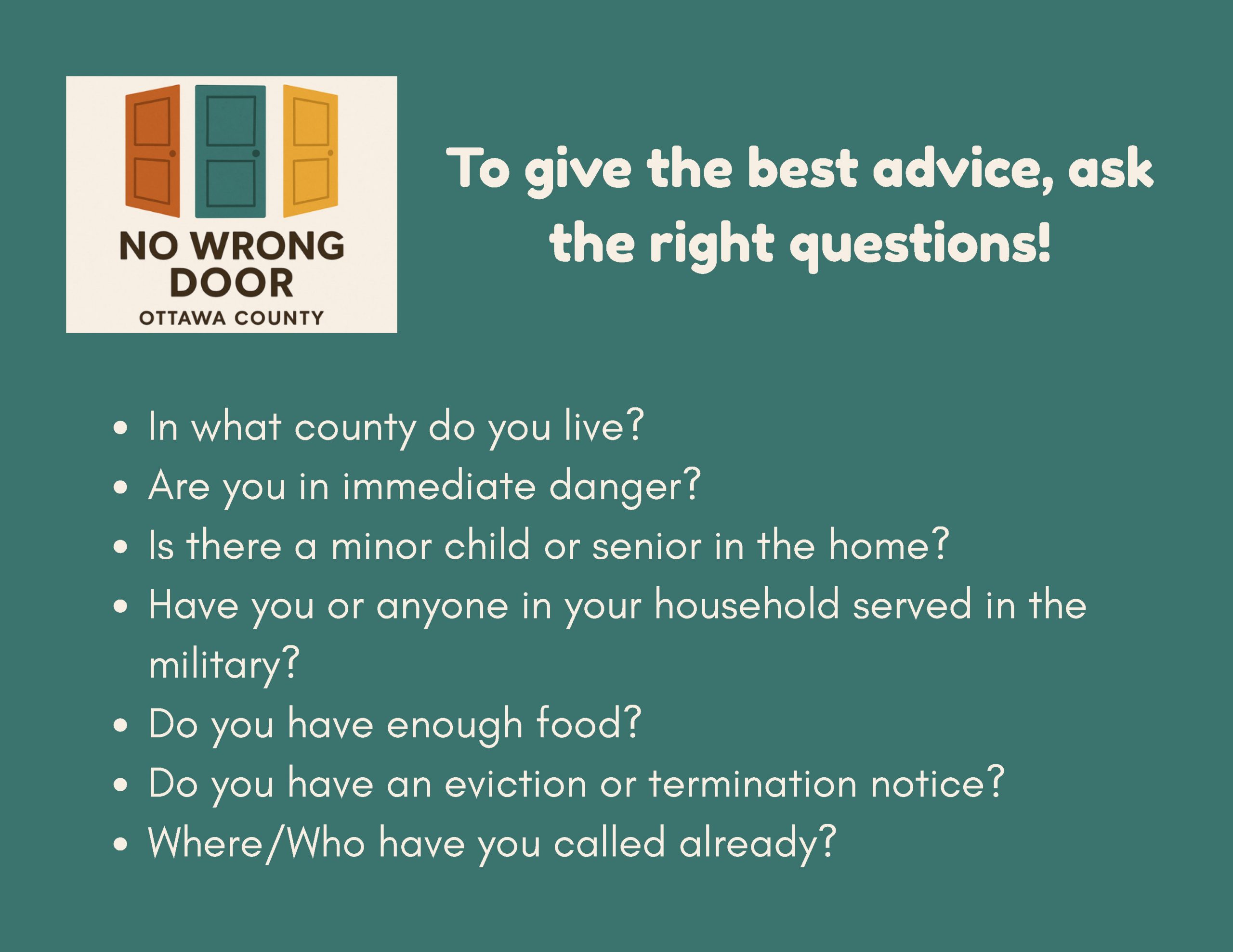 Ottawa County No Wrong Door Training is an opportunity for frontline workers who regularly encounter individuals in crisis to enhance their skills in interacting with people during critical times and to learn about numerous resourecs and agencies in our county to enable warm referrals.